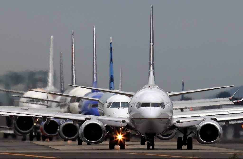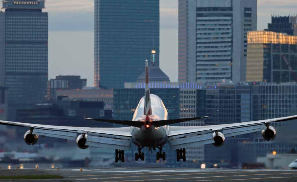 Evening departures await their turn at Boston's Logan International Airport. By Mark Garfinkel.