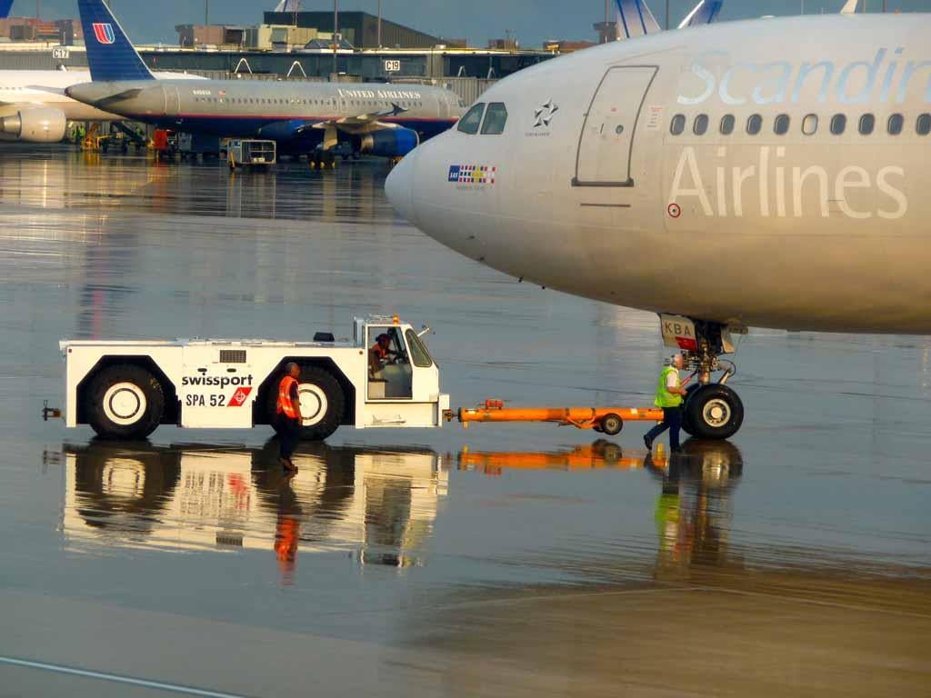 An SAS A-340 takes advantage of a break in the storm front at Dulles airport to rush to the waiting line and become airborne. By Guillaume de Syon.