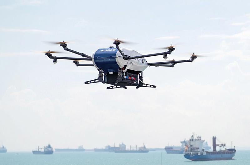 Airbus conducted shore-to-ship trials with its Skyways parcel-delivery drone in Singapore in March. The flight was made to the Swire Pacific Offshore’s anchor handling tug supply vessel M/V Pacific Centurion, 0.9 mi. from the shoreline of Singapore’s Marina South Pier, carrying 3.3 lb. of 3D-printed consumables.