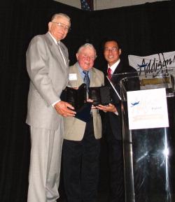 Addison Airport (ADS) founders Jim Deloache, (left) and Henry Stuart (center) receive mementos and proclamations from the town of Addison Mayor Joe Chow during the airport's 50th birthday celebration July 2 at the Cavanaugh Flight Museum. Almost 300 tenants and guests that included Congressmen Sam...