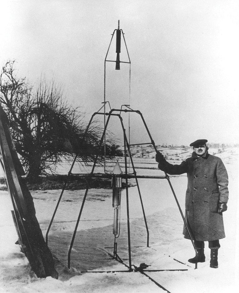 It was an achievement as significant to spaceflight as that of the Wright brothers at Kitty Hawk was to air flight. In 1926, Robert Goddard, a physics professor at what is now Clark University in Worcester, Massachusetts, flew the world’s first liquid-fueled rocket. Solid-fueled rockets had existed for centuries and continue to be useful today. But liquid-fueled engines can provide advantages in energy density, and they can be throttled. Goddard built on the experiments and theory of Russia’s Konstantin Tsiolkovsky, whose work also influenced Hermann Oberth, the father of German rocketry.