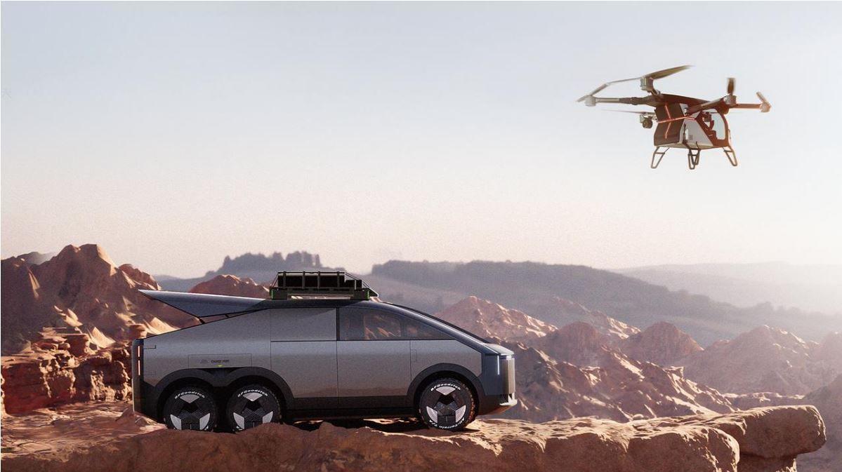 The Land-based Aircraft Carrier from AeroHT features a two-passenger eVTOL and a five-passenger off-road SUV.