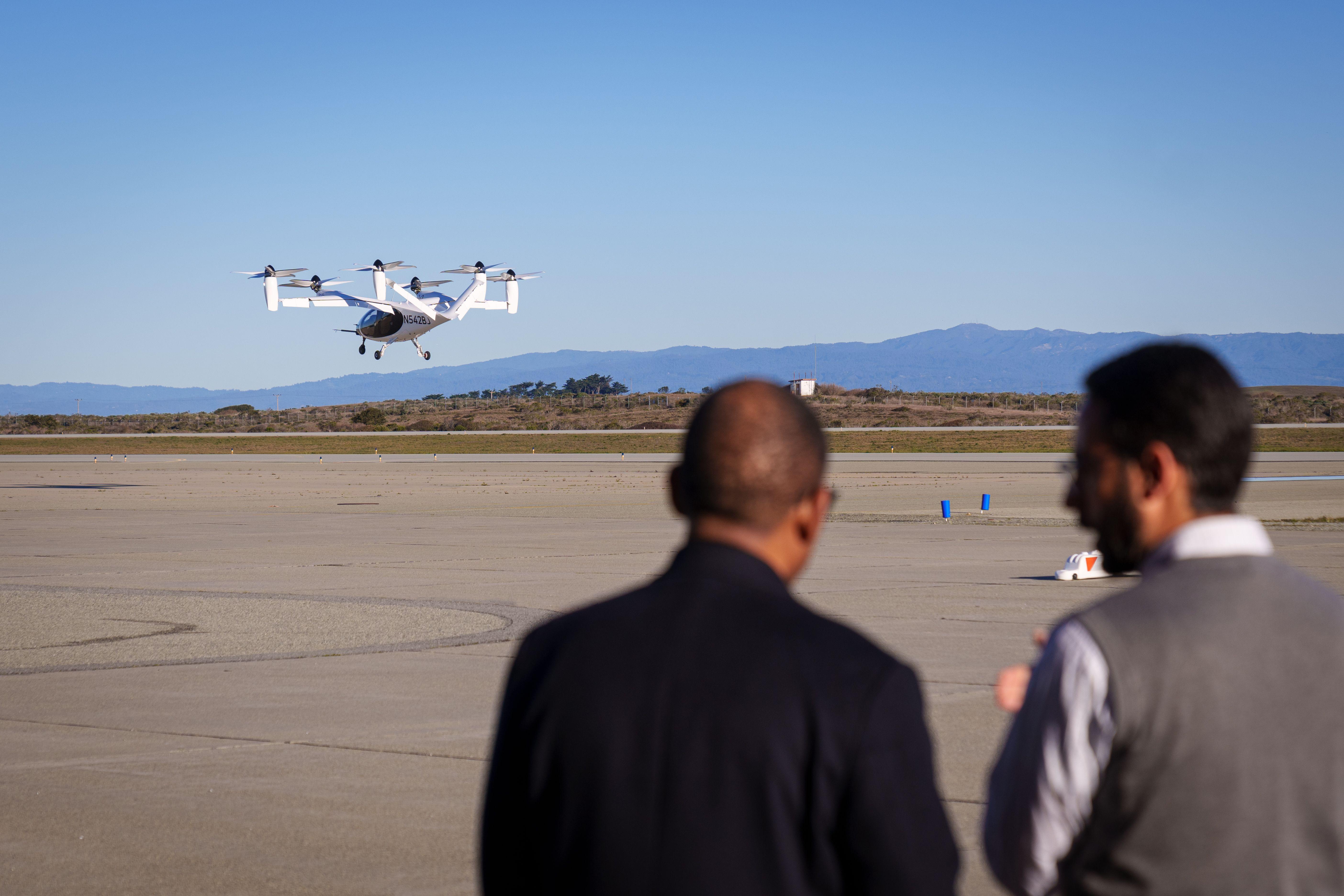 FAA Acting Administrator Billy Nolen and Joby Head of Aircraft OEM Didier Papadopoulos watch Joby’s prototype S4 air taxi take off at Marina Airport, California, on Jan. 30.