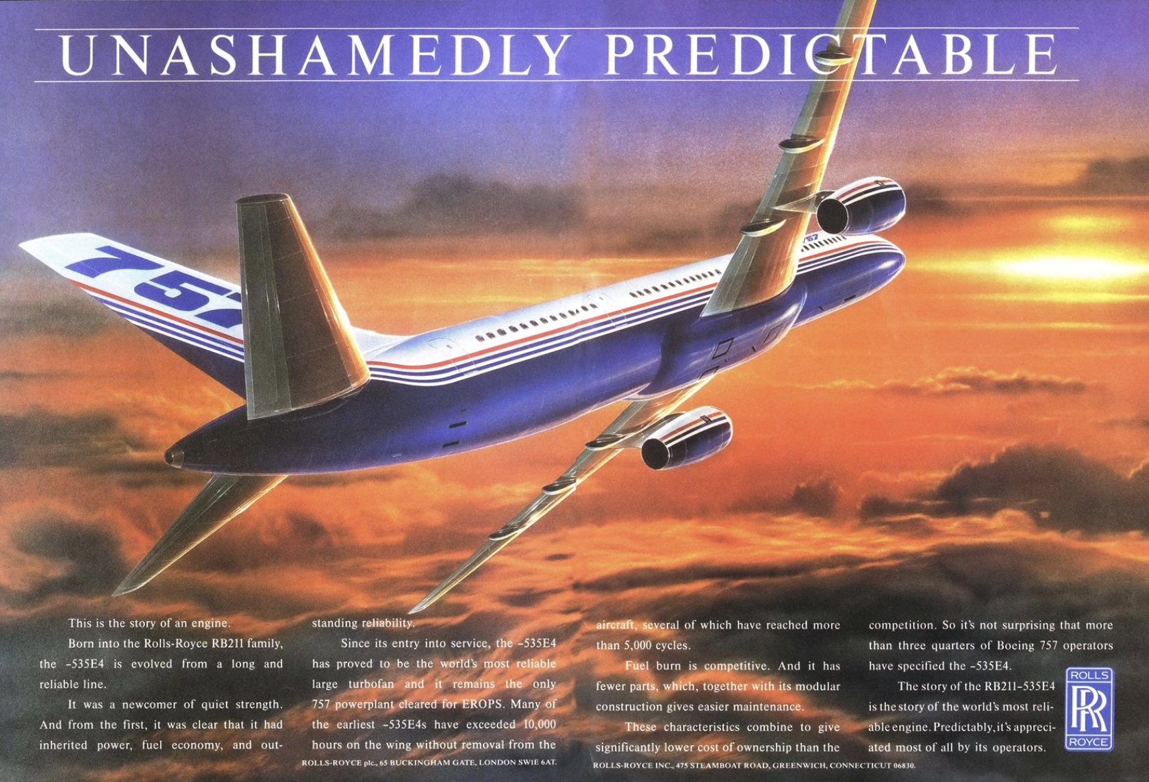 As the sun sets behind a Boeing 757, Rolls-Royce celebrates the story of the RB211-535E4 engine. A poetic story in the advert aiming to inspire confidence in its reliability.
