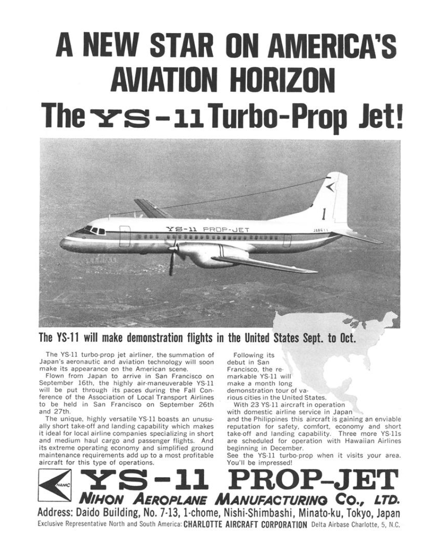 An advert for the NAMC YS-11 turboprop, the last indigenous Japanese large commercial aircraft ahead of the stalled attempt to bring the Mitsubishi SpaceJet to market. 182 YS-11s were built between 1962 and 1974.