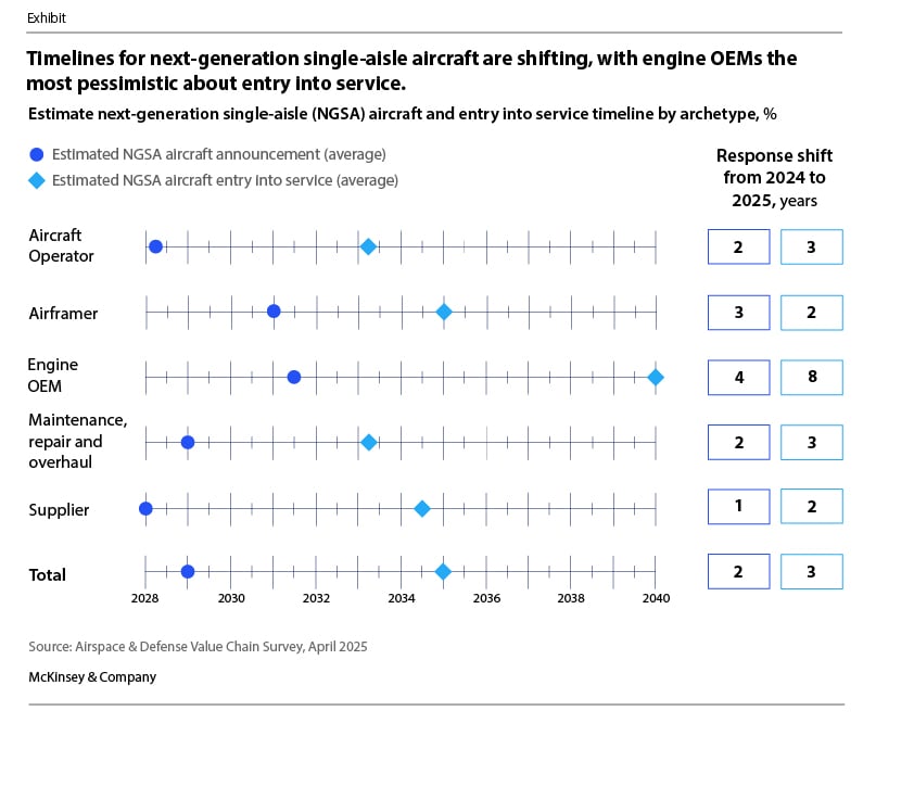 In 2024, McKinsey partnered with Aviation Week to survey commercial aerospace leaders across the entire value chain (Airframe and Engine OEMs, Suppliers, MROs, Operators, and Lessors) regarding their ability to meet current demand and their outlook for future aircraft, future technologies, and the nature of demand. We had expected an extended path to ramp-up for current generation narrow bodies and risk in the path to NGSA, but surprisingly 84% of last year’s respondents predicted that a NGSA aircraft would be fielded by 2035 or before.