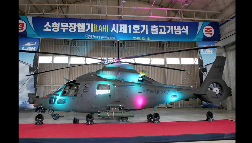Korea Aerospace Industries rolled out the Light Armed Helicopter (LAH) on Dec. 18. Developed with assistance from Airbus Helicopters, and based on its H155, the LAH is scheduled to fly in May 2019 and enter service in 2023. Development of the LCH (Light Civil Helicopter) variant is to be completed in 2021.