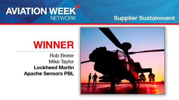 The winning team for the Supplier Sustainment category is the Apache Sensors Performance-Based Logistics team from Lockheed Martin. Rob Breter is the senior program manager for Fleet Support Programs and Mike Taylor is the director for fleet support for the Apache.