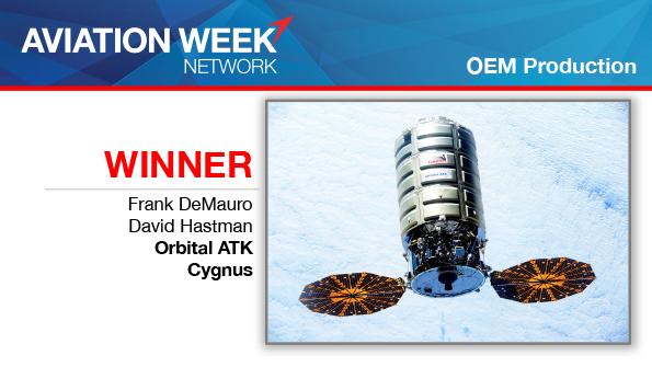 This year’s winner for OEM Production is a first-time entrant, Orbital ATK and the Cygnus commercial cargo system. Leading the program at Orbital are Frank DeMauro and David Hastman.