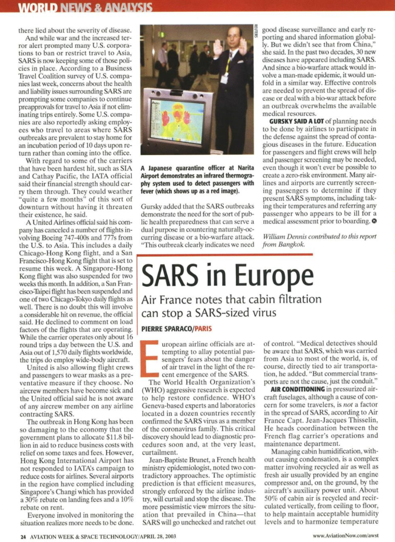 In 2002 airlines were affected by the war on terrorism, the war in Iraq and what reporter Frances Fiorino wrote on page 59 of the April 7 issue of the magazine, “germ warfare, against severe acute respiratory syndrome (SARS), a deadly atypical pneumonia that is spreading rapidly worldwide.”