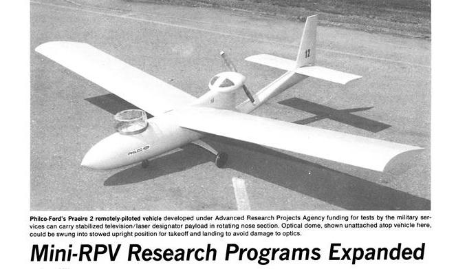 After experimenting with remotely piloted vehicles in Vietnam, ARPA in 1971 began the Mini-RPV program to develop small, low-cost unmanned aircraft for reconnaissance, target acquisition and laser designation. Weighing 75 lb. and powered by a modified lawn-mower engine, the Praerie I first flew in 1973. This led to the U.S. Army’s troubled Aquila RPV program, which was canceled in 1987.