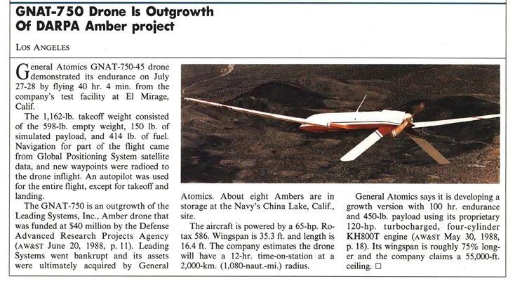 Under the Teal Rain program, Darpa developed the first medium-size endurance UAV. Designed by Israeli engineer Abe Karem, the Leading Systems Amber first flew in November 1986 and in June 1988 set an endurance record of 38 hr. The Amber did not transition to the military, and Leading Systems was acquired by General Atomics, which ultimately evolved the vehicle into the RQ-1 Predator UAV.