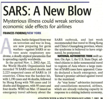 SARS caused the airline industry billions of dollars and thousands of jobs, and nearly felled many Asian carriers. According to IATA, SARS caused the only annual decline in Asia-Pacific traffic in almost two decades before 2003.