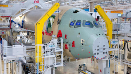 Airbus has begun the final assembly of the first A350 XWB at its new final assembly line in Toulouse after delivery of the center fuselage Wednesday from St. Nazaire, France.