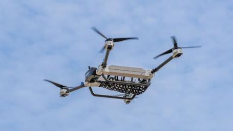 Eanan Al Samma's Rikaz is a multicopter electric vertical-takeoff-and-landing (eVTOL) vehicle with four three-blade propellers mounted on arms.