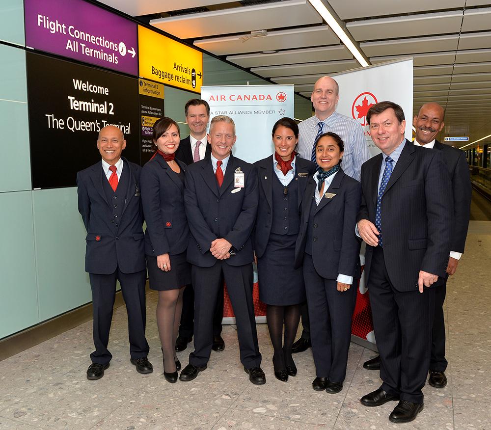 Crew of Air Canada’s first flight AC856 with John Holland-Kaye, Development Director and Chief Executive Officer designate, Heathrow (third from left); Gary Cross, Senior Director International Support Services, Air Canada (fourth from right); Chris Garton, Managing Director International Operations, Air Canada (second from right); and Kelvin Ogunjimi, Manager International VIP & Concierge Services, Air Canada (far right). ATW Photo: Courtesy, Air Canada