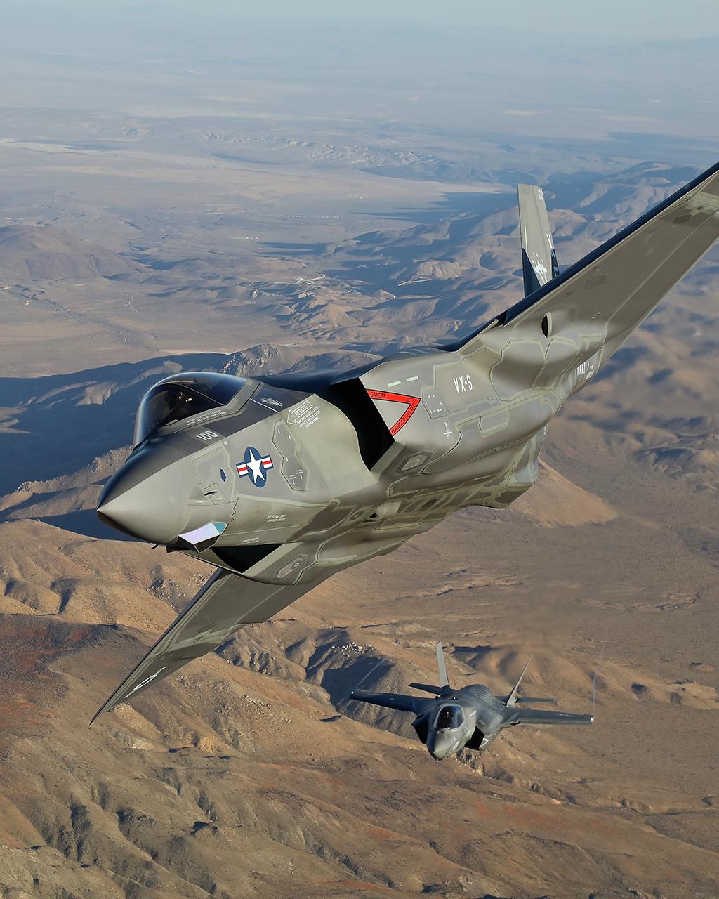 An F-35B and -C fly a test mission from Edwards AFB, California.