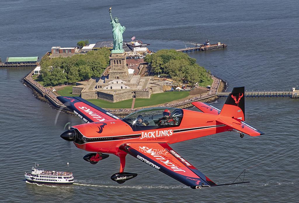 Air show pilot John Klatt flies his Extra 300L over the Statue of Liberty during Memorial Day weekend.