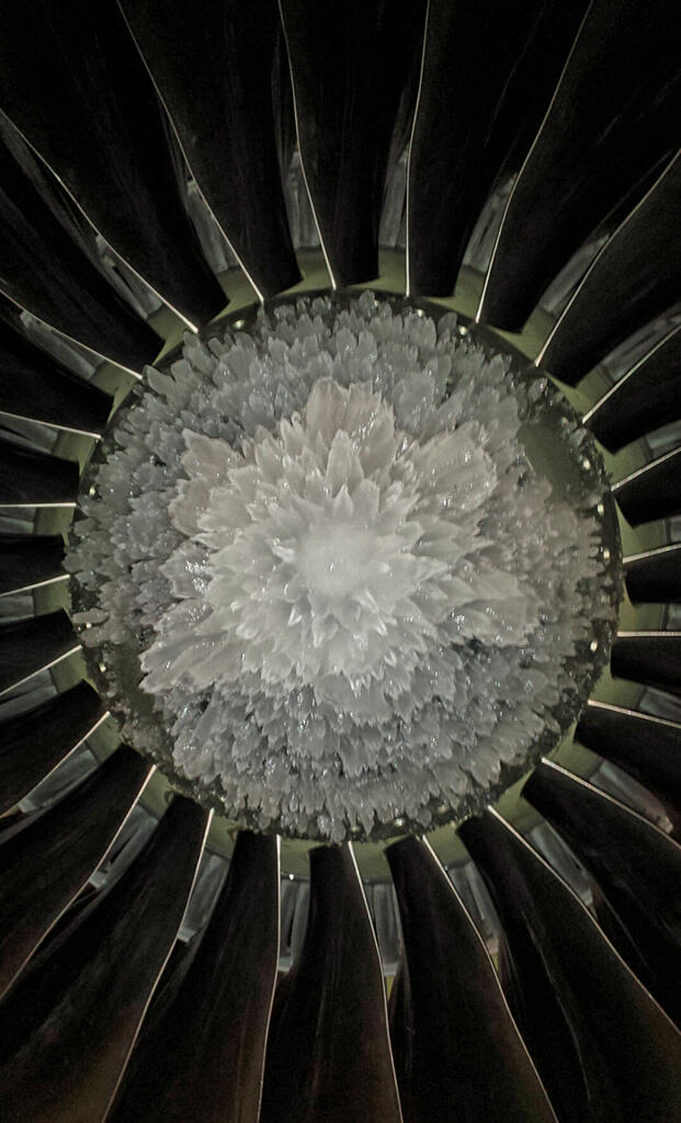 A flower of ice covers this 737 engine prior to deicing in Dallas.