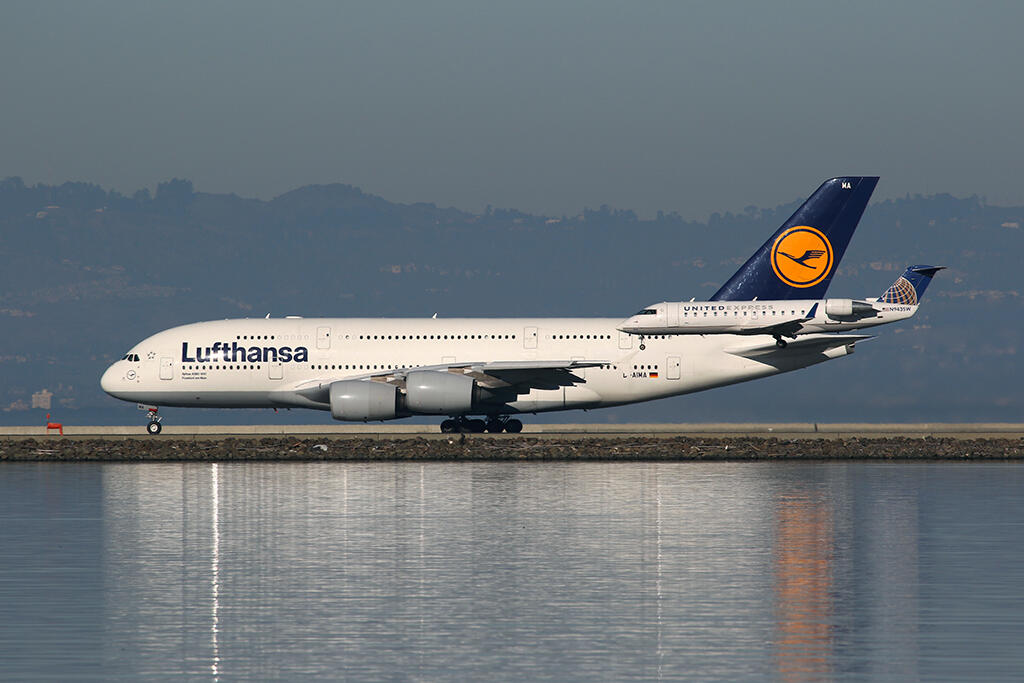 A Lufthansa A380 awaits departure clearance on Runway 28R while a United Express/Skywest CRJ-200 lands on Runway 28L. The CRJ can easily be confused as an appendage on the Super Airbus!