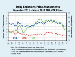 European Union emission allowance (EUA) prices declined in March on fading expectations that the regulator will intervene to withdraw supply from the market. EUAs for December 2012 delivery under the EU emissions trading system (ETS) fell as low as €6.93 ($9.25) per metric ton on March 22, down from...