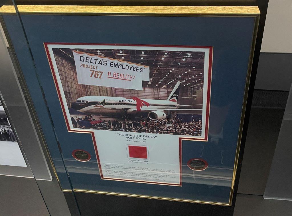 [From Delta Flight Museum] A 12-foot-wide red ribbon that was tied around the aircraft for the 767’s unveiling on December 15, 1982, was cut up into squares and a piece of that ribbon—with a picture of that ceremony—was presented to every Delta employee at that time.