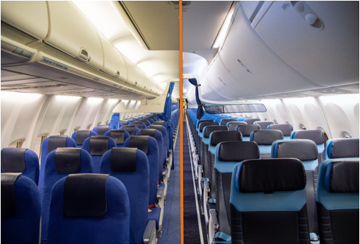 KLM Royal Dutch Airlines has started the complete renewal of the cabins of 14 Boeing 737-800 aircraft, for both business and economy class. Pictured, left, is the old cabin; the right is the new one. The refurbished aircraft, which are mainly used for European flights, offer passengers more comfort and style and consume less fuel because the renewed cabin weighs 700 kilos less. The first refurbished aircraft has already gone into service. In March 2022, the interior of the last in this series of 737-800s will be completely transformed. All activities are carried out by KLM’s Engineering and Maintenance division.
