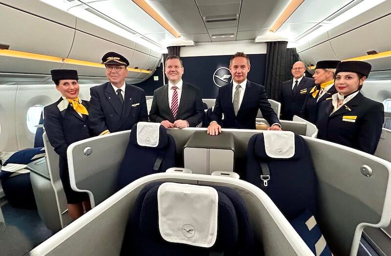 Lufthansa Airlines CCO Heiko Reitz (center, left) and Lufthansa Airlines CEO Jens Ritter (center, right) unveil the Allegris business class product at Munich Airport.