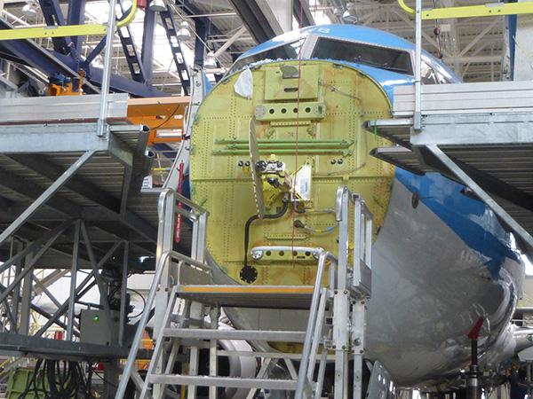 LTSF can accommodate and service eight narrowbody aircraft for base maintenance simultaneously. The expansion of the facility, right in the picture, increased LTSF capacity by 40% from 5 to 8 aircraft bays.
