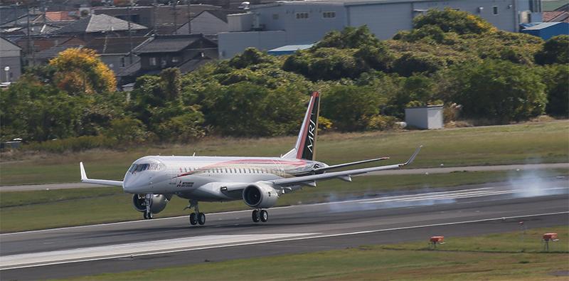 The first MRJ returning to Nagoya Airport, the location of the Mitsubishi Heavy Industries plant where it was assembled. First delivery of the MRJ is due in the second quarter of 2017, 3.5 years behind the target set when the program was launched in 2008.