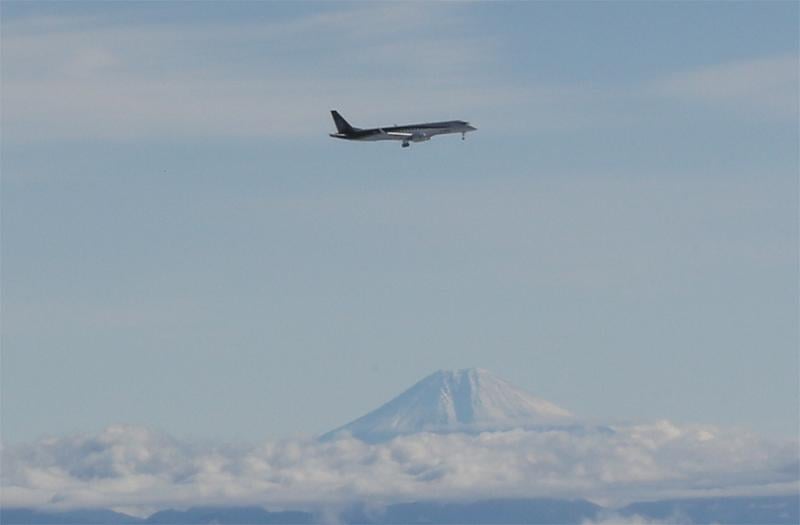 The first MRJ on its first flight, with Mount Fuji in the distance.
