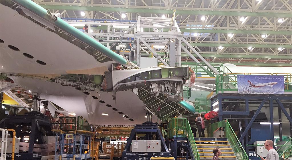 Pictured before the final body join took place, sections of WH001 are marshaled together on a streamlined production line empty of the traditional fixed tooling monuments previously used at this stage of the assembly process. Boeing completed construction of the static-test aircraft—the first 777X airframe to be built—in just 16 days in September, versus the 20 for which it was budgeted. The first flight-test airframe was built in 20% less time than the static airframe, says Boeing.