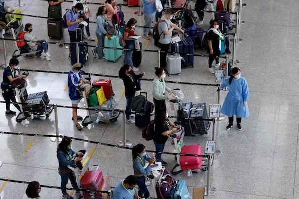 Arrivals at Hong Kong International Airport queue up for shuttle buses to quarantine hotels on Aug. 1.