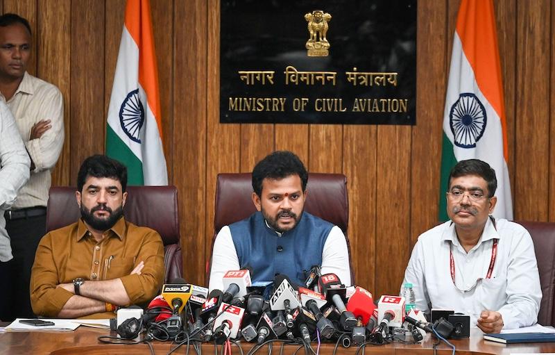 India's Civil Aviation Minister Rammohan Naidu (center) and Murlidhar Mohol (left), minister of state for civil aviation, addressing the media after the crash of Flight AI 171.