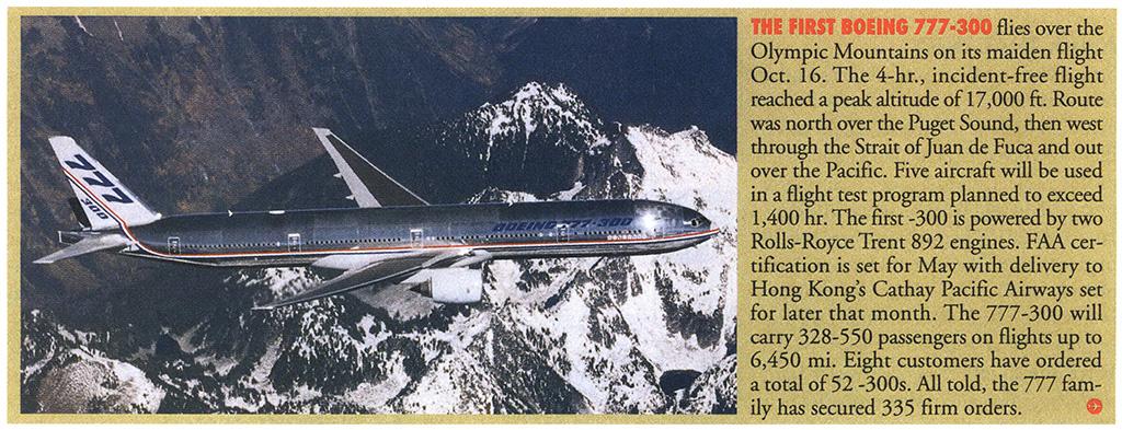 Stretched over the baseline 777-200 with a 210-in. forward fuselage plug and a 189-in. plug aft, the 242-ft. 4-in. 777-300 was longer than the 747-400, making it the longest commercial jetliner in the world at that time. First flight of the Trent 800-powered aircraft was on Oct. 16, 1997, marking the first time any Boeing widebody aircraft had been powered by a Rolls-Royce engine for its initial flight.