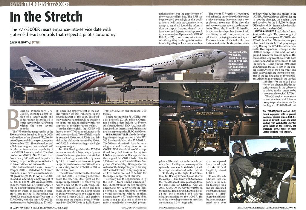 Linked to the development of General Electric’s more powerful GE90-110/115B turbofan, Boeing launched the 777-300ER, the first of a second-generation 777 family, in 2000. Based on the extended fuselage of the baseline 777-300, the -300ER incorporated a strengthened structure, extended and raked wingtips and a modified main landing gear. The first 777-300ER was delivered to Air France in April 2004 and became a best-seller for the company, with almost 800 delivered through early October 2018. AW&ST's test pilot, then-Editor-in-Chief David M. North, flew the 777-300ER in the spring of 2004, and his pilot report appeared in the April 5, 2004, issue.