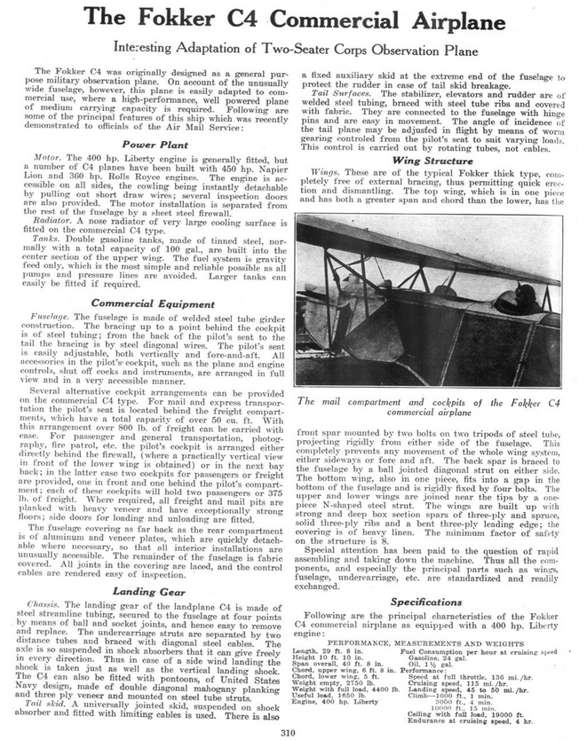 The Fokker C4 was originally designed as a general purpose military observation plane. On account of the unusually wide fuselage, however, this plane is easily adapted to commercial use, where a high-performance, well powered plan of medium carrying capacity is required.