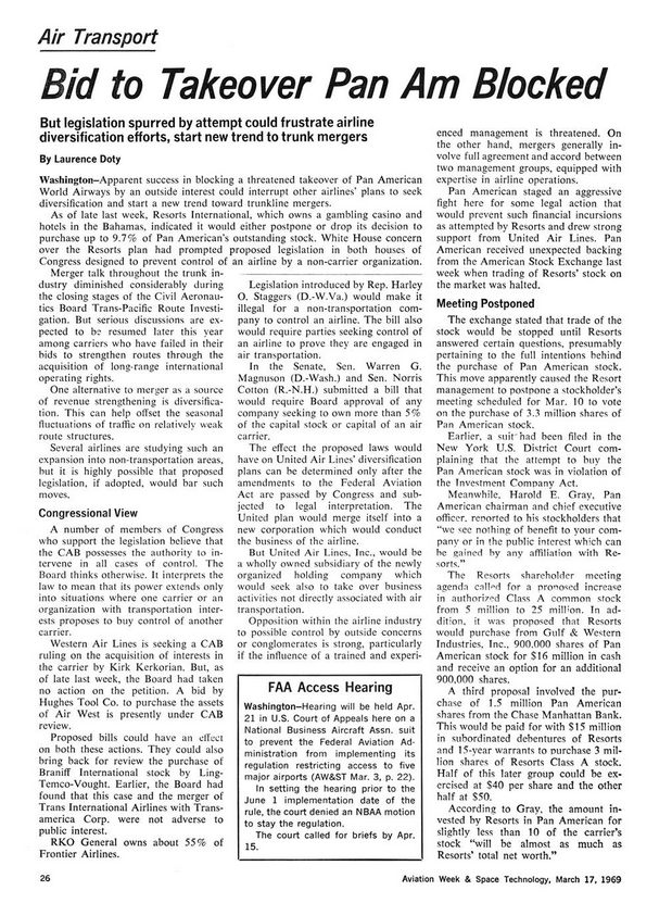 Apparent success in blocking a threatened takeover of Pan American World Airway by an outside interest would interrupt other airlines' plans to seek diversification and start a new trend toward trunkline mergers.