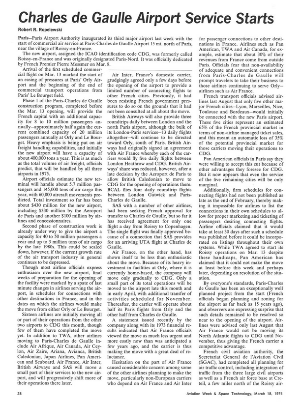 Paris Airport Authority inaugurated its third major airport last week with the start of commercial air service at Paris-Charles de Gaulle Airport 15 min. north of Paris, near the village of Roissy-en-France.