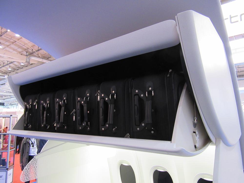Boeing displayed its new roomier overhead bins, called Space Bin, for the 737. Each Space Bin holds six standard carry-on bags, two more than the current Boeing Sky Interior pivot bins. That allows for 194 total bags on a 737-900ER or 737 MAX 9, compared to 132 in the current bin configuration; 174 compared to 118 on a 737-800 or 737 MAX 8; and 130 compared to 90 on a 737-700 or 737 MAX 7. Photo by Karen Walker