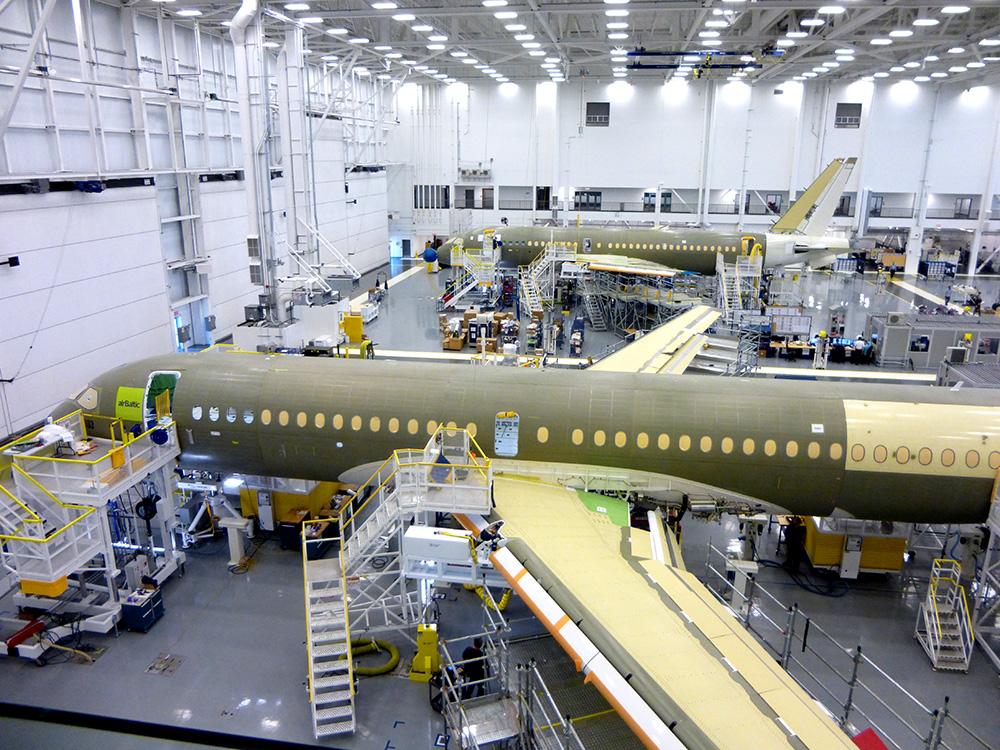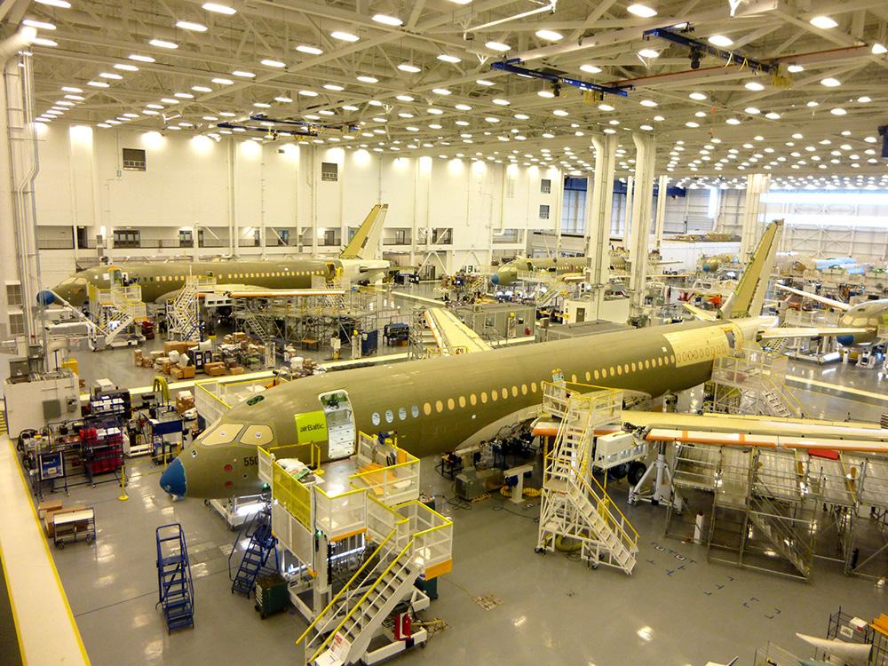 A CS300 and CS100 in production at Bombardier’s production facility in Montreal. It normally takes 32 days to assemble one aircraft.