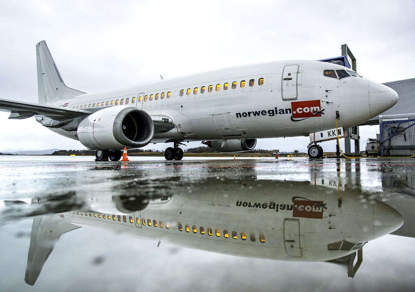 Norwegian’s last Boeing 737-300, LN-KKW, sits on a rain-swept Bodø apron, before becoming a museum exhibit there.