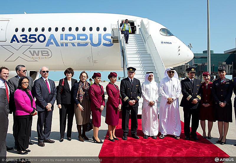 Airbus A350 XWB flight test aircraft (MSN3) has made its premiere appearance at Doha’s new Hamad International Airport, on its way to the Singapore Airshow. The visit is part of the entry-into-service preparations between Airbus and Qatar Airways, the A350 XWB launch customer that will take delivery of its first of the type in the fourth-quarter. To date, the A350 XWB has won 812 orders from 39 customers. Pictured: Qatar Airways CEO Akbar Al Baker and A350 XWB program head Didier Evrard, with Qatar-based dignitaries and airline staff.