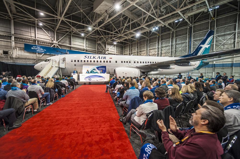 Singapore Airlines regional affiliate SilkAir has taken delivery of its first Boeing 737-800, marking the start of the carrier’s transition to an all-Boeing fleet. Over the coming years, Boeing will deliver a total of 23 737-800s and 31 737 MAX 8s to SilkAir. Pictured here is a celebration with company and airline employees at Boeing Field in Seattle on Feb. 3. ATW Courtesy, Boeing