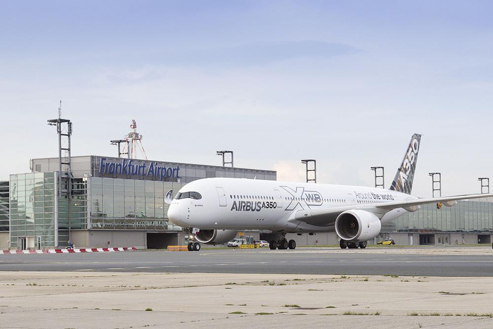 The Airbus A350-900 developmental aircraft MSN005 visited Lufthansa’s Frankfurt hub on July 25-26, as part of a three-week global route proving tour. ATW Photo: Courtesy, Airbus
