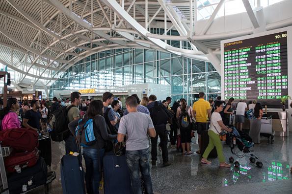 Passengers at Ngurah Rai International Airport on July 10 in Denpasar, Bali, Indonesia due to volcanic ash cloud from Mount Ruang.