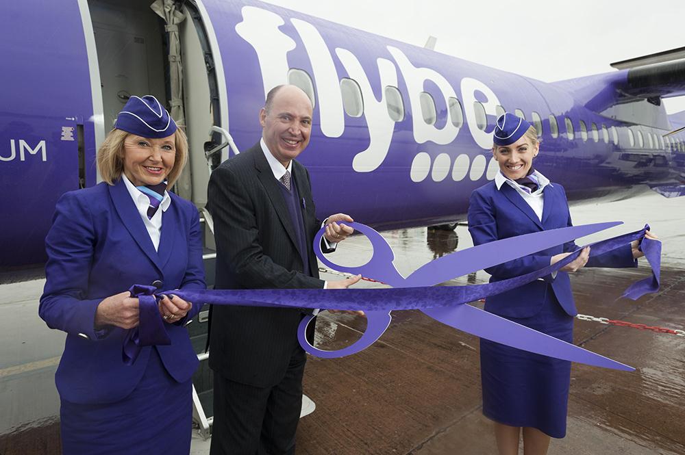 Flybe CEO Saad Hammad cuts the ribbon on Flybe's new purple livery on its Bombardier Q400 aircraft. The new livery will be gradually rolled out across its fleet over the next three years. ATW Photo: Courtesy, Flybe