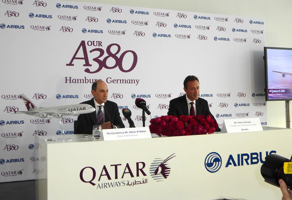 Qatar Airways Group CEO Akbar Al Baker and Airbus president and CEO Fabrice Brégier speak at a press conference at Hamburg Finkenwerder Airport. ATW Photo: By Kurt Hofmann