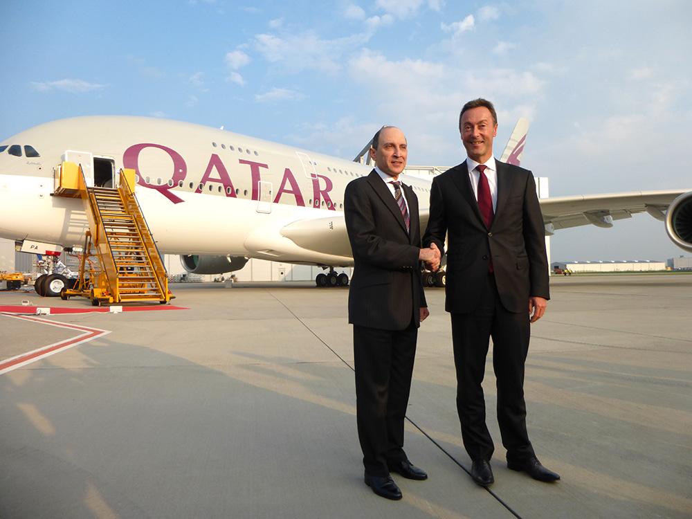 Qatar Airways Group CEO Akbar Al Baker and Airbus president and CEO Fabrice Brégier begin a tour of the A380. ATW Photo: By Kurt Hofmann
