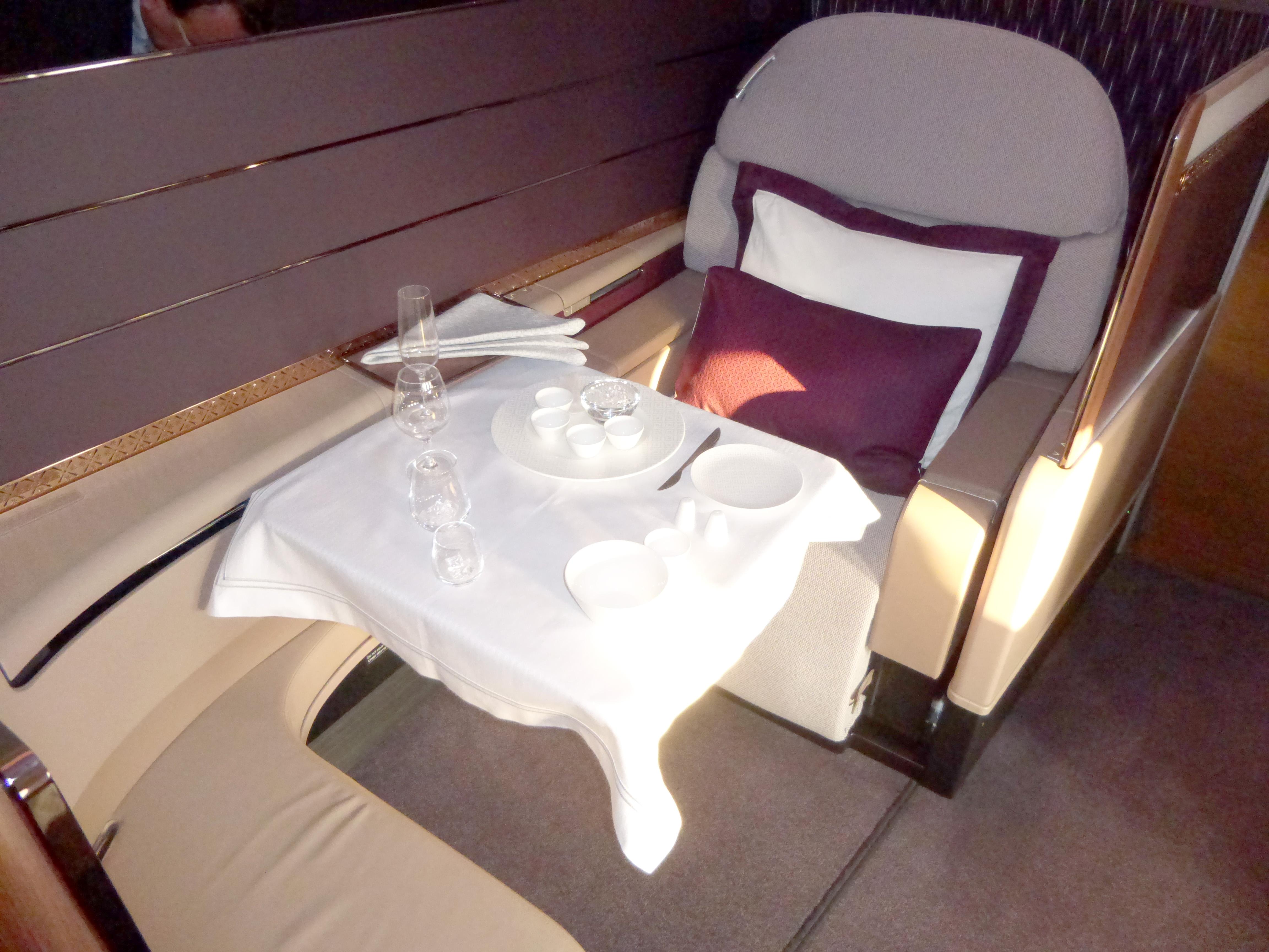 Qatar A380 first-class seating. ATW Photo: By Kurt Hofmann